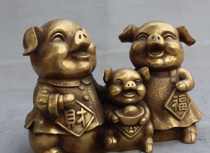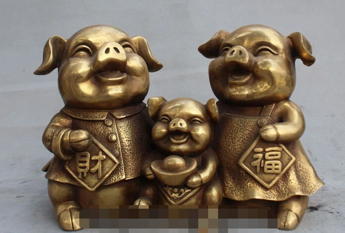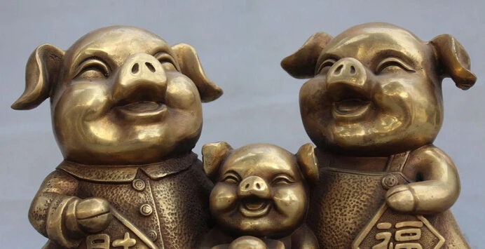 HOT SALE p6691 10" Chinese Bronze Zodiac Wealth YuanBao CaiFu 3 Happy Pig Family Statue Animal