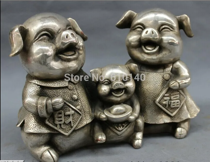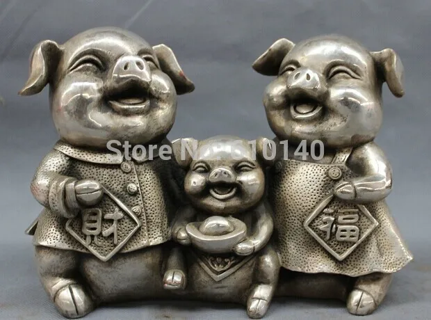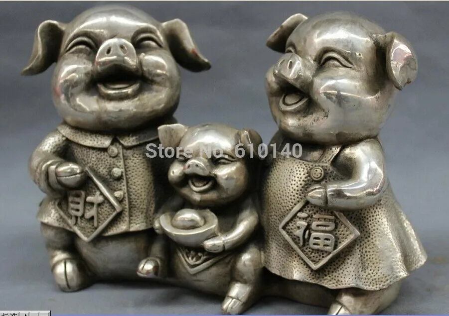 REVIEW TOP SELLER 9" Chinese Silver Folk Year Zodiac Family YuanBao Cai Fu 3 Happy Pig Man Statue